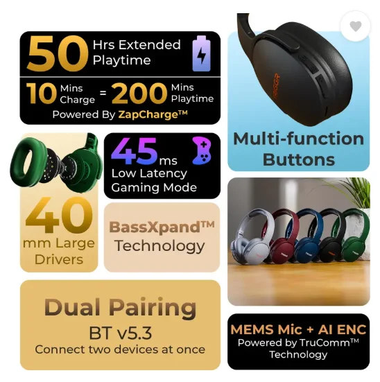 Crystal Clear Communication - Powered by Trucomm tech, the MEMS microphones capture your commands perfectly and AI ENC reduces the background noise effectively, resulting in crystal clear communication and crisp call quality.Dual Pairing and Low Latency Gaming Mode- The dual pairing feature of Trinity 2 which allows you to seamlessly switch between devices. And, a low latency of 45ms ensures that your gaming sessions are smooth and lag free. 1 Year Domestic Warranty