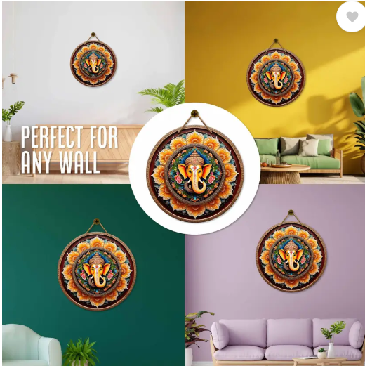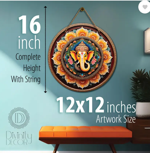 Divinity Decor Ganesh Ji in orange and golden mandala Wooden wall Hanging Multicolor